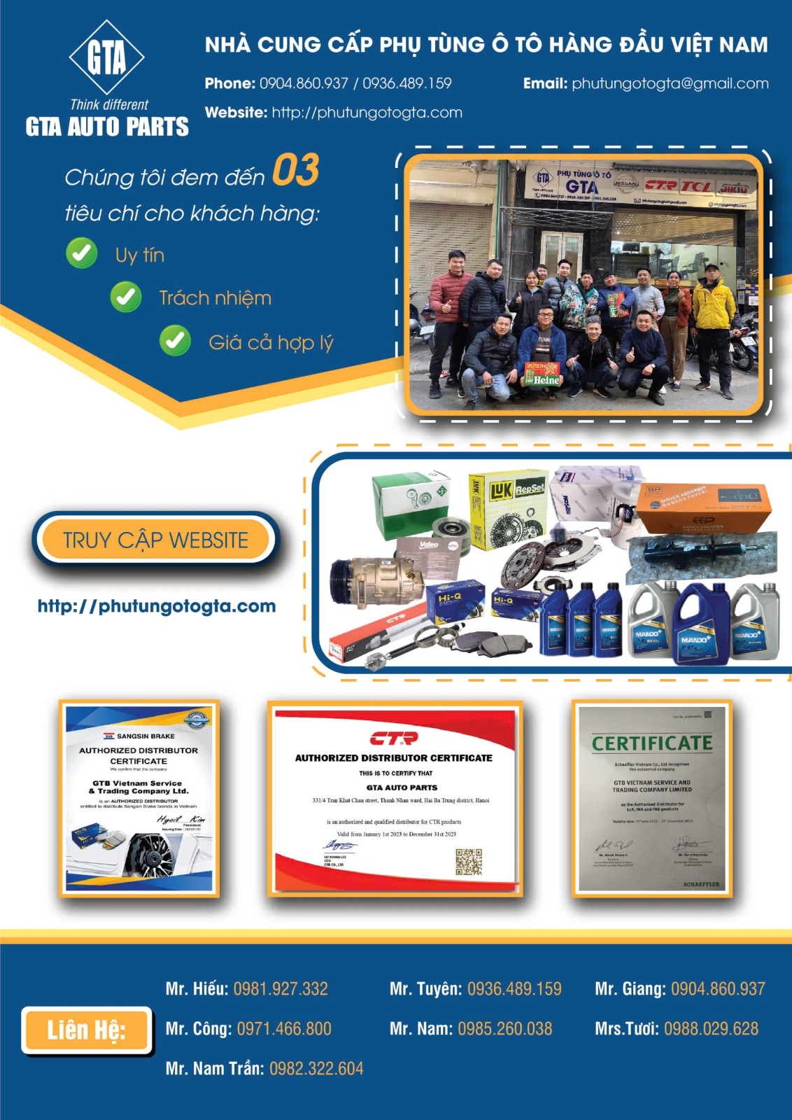 Phụ tùng ô tô GTA xin gửi tới Quý khách hàng lời chào trân trọng, cùng lời chúc sức khỏe và thành công.