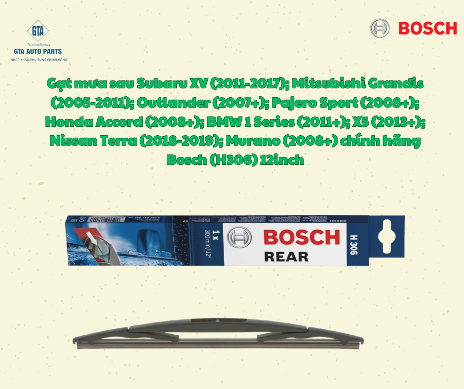 Gạt mưa sau Subaru XV (2011-2017); Mitsubishi Grandis (2005-2011); Outlander (2007+); Pajero Sport (2008+); Honda Accord (2008+); BMW 1 Series (2011+); X5 (2013+); Nissan Terra (2018-2019); Murano (2008+) chính hãng Bosch (H306) 12inch