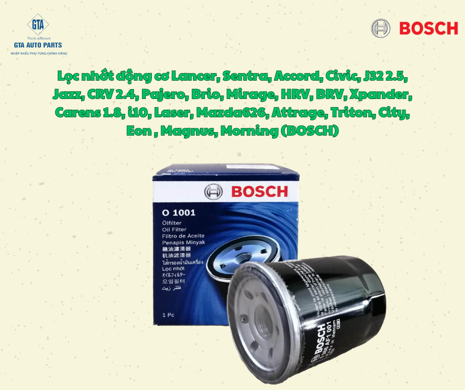 Lọc nhớt động cơ Lancer, Sentra, Accord, Civic, J32 2.5, Jazz, CRV 2.4, Pajero, Brio, Mirage, HRV, BRV, Xpander, Carens 1.8, i10, Laser, Mazda626, Attrage, Triton, City, Eon , Magnus, Morning (BOSCH)