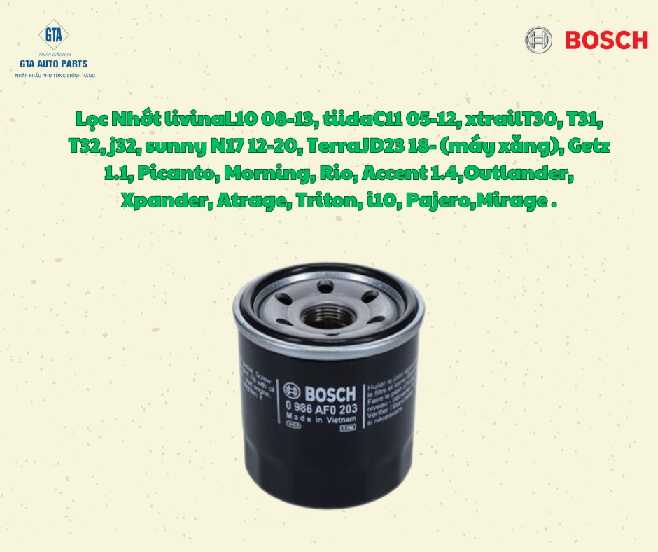 Lọc Nhớt livinaL10 08-13, tiidaC11 05-12, xtrailT30, T31, T32, j32, sunny N17 12-20, TerraJD23 18- (máy xăng), Getz 1.1, Picanto, Morning, Rio, Accent 1.4,Outlander, Xpander, Atrage, Triton, i10, Pajero,Mirage (BOSCH)
